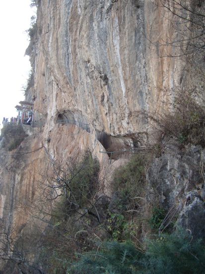 Die Dragongate selbst besteht aus einer senkrechten Felswand, in die ein Fußpfad eingemeißelt wurde, der tief hinab zum Dianchi lake blicken läßt.