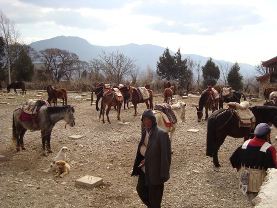 Gut ausgeschlafen ging es somit am nächsten Morgen zu dritt per Pferd hinauf zum Yulong mountain. Dieser Berg misst eine stattliche Höhe von 5600 m. Das flache weite Tal um Lijang ist auf knapp 2200 m gelegen.