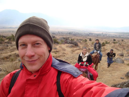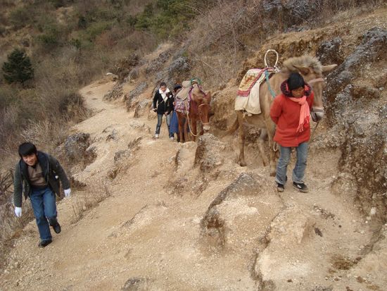 wie der Weg dann aber beschwerlicher wurde, fühlte sich keiner mehr von uns auf dem Pferd wohl und so beschlossen wir allesamt die zur Hälfte zu Pferd angeplante Bergstrecke nun bereits zu Fuss zurückzulegen. Die Muis waren uns nur noch Begleit. Mein alter Gaul hatte es eh nicht leicht mit meinen 85 kg zuzgl. Verpflegung. Und wenn ich etwas hasse, so ist es ein Tier den Berg hinauf zu quälen und sich dabei selbst einen faulen Lenz zu machen.