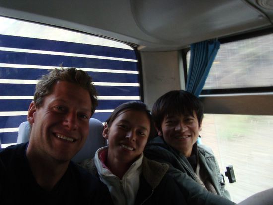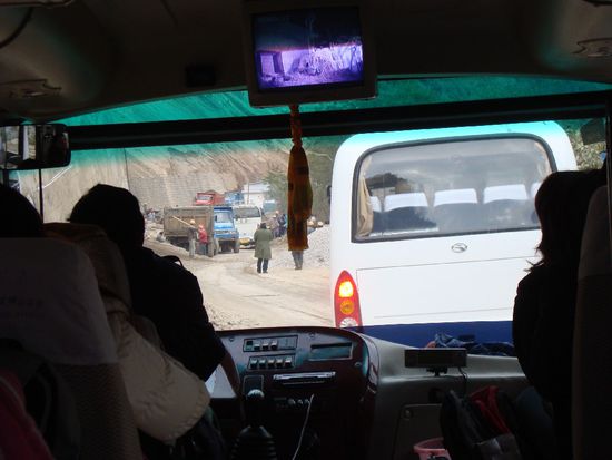 Den Ort, den wir anstrebten abends erreichen zu wollen, blieb unerreichbar, da der Abschnitt des Weges die letzten 7 km dorthin ab 16 Uhr geschlossen wurde. So hielten wir einen Bus an, der aus dem Tibet auf dem Weg nach Kunming war, was für uns nur die halbe Strecke nach Lijang bedeutete. So waren wir dem Ziel schon um die Hälfte näher. Die Tibetianer sind von eher härterem Holz geschnitzt und so knöpfte uns der unhöfliche Fahrer ne Menge Geld für die Stunde Fahrt ab. Nach halber Strecke machte der Bus dann noch für 2 Stunden halt zwecks Nahrungsaufnahme und auf einen Mitreisenden wartend. Hätte Armanda nicht die Nummer des Hinfahrt-Fahrers gehabt, hätten wir wohl in dieser Nacht nicht mehr zurückgefunden.
