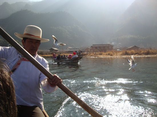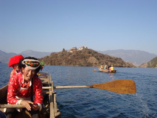 und Mosuo- Frauen, die den Kahn so schnell durch Paddeln fortbewegen und ihre Männer einzig zum Steuern benötigen, daß ich sie damals gerne beim Rudern im Boot gehabt hätte um den Sieg an einer Regatta zu sichern.