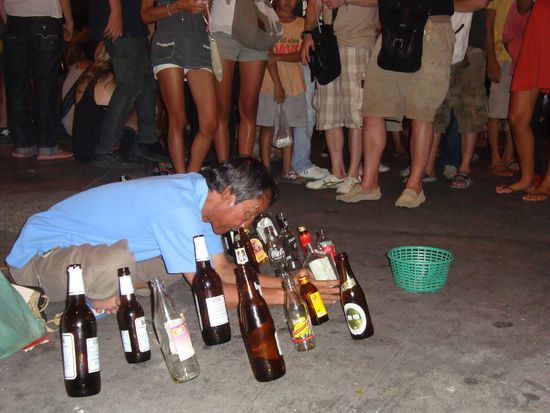 Nun, ich jedenfalls habs zunächst gute 5 Tage in Bangkok ausgehalten, ohne dass mir langweilig wurde. Es gab ja unter anderem doch einiges zu betrachten, wie hier diesen Herrn, der es schafft, jede Flasche in einer schier unmöglichen Position zum Stehen zu bekommen.