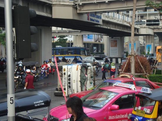 was gabs noch..ach, die spektakulären Verkehrsunfälle, bei denen man natürlich zu der grossen Schar der Gaffer gehören möchte, insbesondere dann, wenn es ein Motorradfahrer schafft, sich noch vor den vor 10 Minuten gestrandeten LKW zu legen, in 10 Sekunden aufzustehen und gemütlich weiterzufahren, als wäre nichts passiert. Ein harter Thai im Nehmen mit der richtigen Schutzkleidung, oder evtl. ein Thaiboxer, die stecken ja auch ne Menge weg. Dem LKW- faher jedenfalls war nicht wirklich mehr zum weiterfahren.