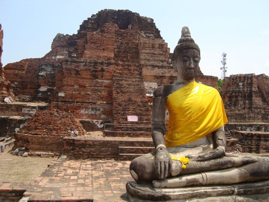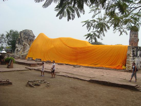 Die Reise führte auf meinem Blacky pedalo heraus aus der 7,5 Mio- Einwohnermetropole auf dem zunächst ein oder anderen recht stark befahrenen Highway in nördliche Richtung nach Ayuthaya. Die Strecke war flach und schnell, die LKW- faher gaben mir oft ein freundliches "ich Hup dich an" und so war zusätzlich mutiviert die berühmte Stadt, die einzigartig inmitten einer von drei zusammenführenden Flüssen geschaffenen Insel liegt und lange Zeit den burmesischen Angriffen standgehalten hat und denn doch viel, nach gut 5 Studen erneut erobert.