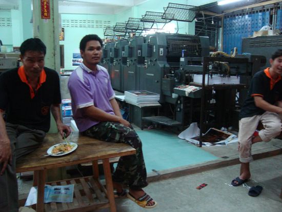 Sukothais wesentlicher Besuchermagnet sind sicherlich die Tempel und nicht jene Heidelberg- Druckmaschine in einer städtischen Druckerei, doch für mich natürlich fast aufregender. Jedenfalls gehts ja HD im Moment sehr schlecht, wenn man von den tausenden Entlassungen hört, die anstehen. Ihr sehr aber, das alte Modell hier läuft immer noch wie ne Eins, also Grund Genug HD Maschinen zu kaufen, gebt das bitte weiter!