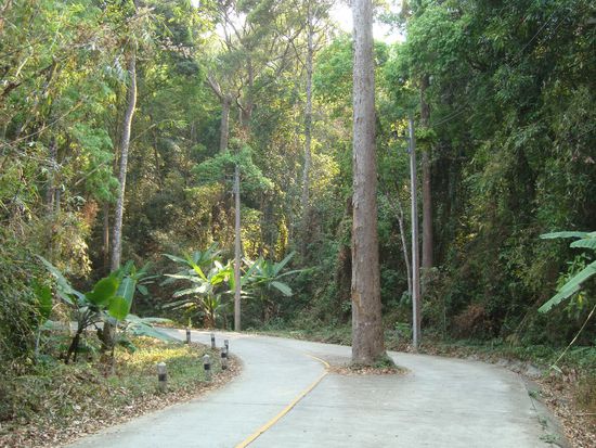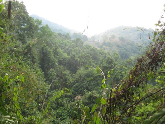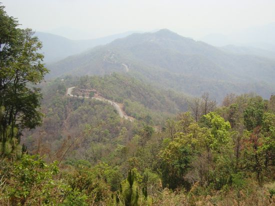Die Radtour führte von Chiang Mai zunächst 50 km in südliche Richtung und dann westlich hinauf zum Doi Inthanon, dem höchsten Berg Thailands auf 2500 Metern im Doi Inthanon Nat.park und wieder hinab auf der anderen Seite zu meinem ersten Übernachtungsstop in Mae Chaem.