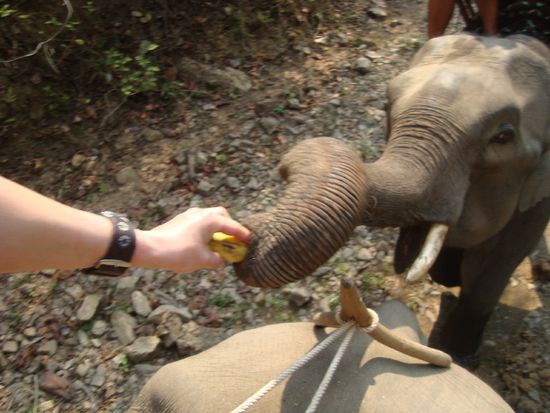 Ja, so ein Elefantenritt am Fluss, das hat man nicht alle Tage. Nur das Absteigen machte uns etwas zu schaffen, denn wir mussten an den sanften Riesen noch zuvor alle Bananen zusteuern.