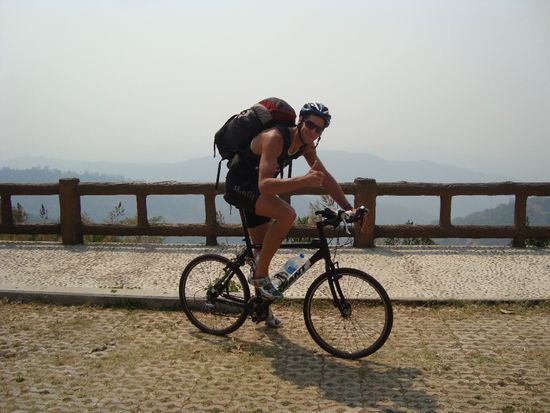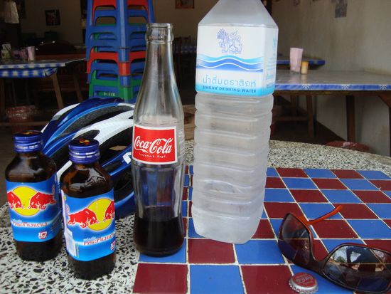 Ich hab die Steigungen nach 100 km nicht mehr gezählt doch die manchmal über 15% Steigung ließen mich das ein oder andere Mal in Zickzacklinie die Berge hinaufquälen. Nach den recht kurzen steilen Abfahrten lauerte dann schon wieder die nächste Wand. Jedenfalls ist die Nahrungs- und Flüssigkeitsaufnahme ja wesentlich entscheidend dafür, wann die Beine Protest anmelden. Mit Cola und diesen Thai-Red Bull Dingern für gut 20 €-cent, viel Wasser, einer guten Nudelsuppe oder dgl. fand ich mittlerweile die beste Mischung, die Steilpisten hinter mir zu lassen.