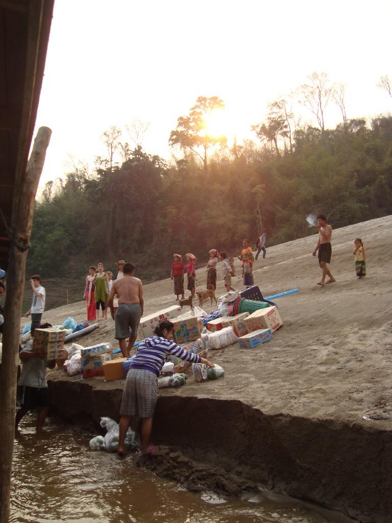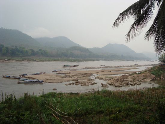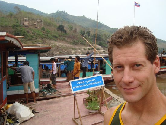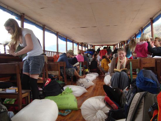 Das andere Ufer mit "Brave Blacky" erreicht, setzte ich mich nach 2 Stunden Visacheck aufgrund all der Touristenflut und einem Beinahecrash mit dem Rad auf dem Weg zur Anlegestelle (da auf einmal wieder Rechtsverkehr!!- die Dame im Auto sowie meiner einer schauten uns gut 5 Sekunden lang verdutz an, ehe sie mir meine Fahrbahnseite durch Handbewegung deutlich machte ) in die 2 Tages- Fähre nach Luang Prarang. Nun, die meisten anderen Eingeschifften wählten die gleiche Reisevariante und so legte sich "BB" aufs Dach und genoss das Flusspanorama von oben. Nun, unter dem Dach gab es dafür mehr zu erzählen,