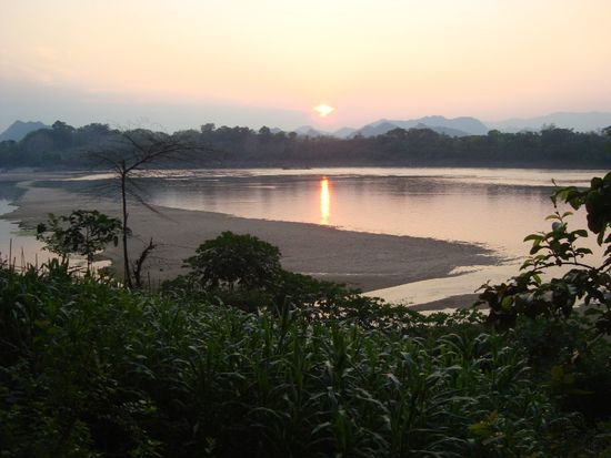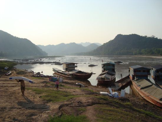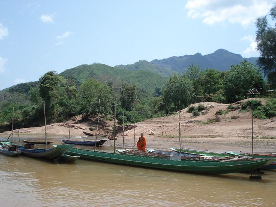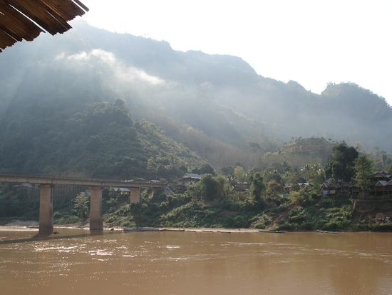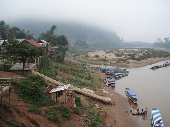 Der Grenzwechsel von Thailands Chiang Kong mit dem Boot auf die andere Seite des Mekong river ins Laotische Huay Xai verlief "beinahe" ohne Aufregung. Kann nicht leumden, dass ich Opfer einer Tuk-Tuk-Fahrer- Grenzbeamtenmafiaaktion wurde, in dessen Fettnäpfchen mit Sicherheit regelmäßig Reisende treten. Viele Thailandreisende die nach Laos wechseln planen oftmals auf den letzten gültigen Visatag, da allein schon Thailands Norden zu umfangreich ist, um vor Ablauf der 4 Wochen bereits einen Grenzübergang zu vollziehen. Nun, mein Visa verstrich am 07.04., der Grenzübergang sollte nach Lonelyplanet und Aussage anderer Reisender bis 18:00 möglich sein. Mit Busankunft um 16:30 war nach ganz sicherer Aussage des Herrn Tuk Tuk seit 16:00 kein Laos mehr möglich. Nach einer weiteren Nacht in Thailand erfuhr ich denn am nächsten Morgen am Pier doch die 18:00- Version, den Grenzbeamten ließ das natürlich kalt, mich kostete es einen Tag Visaüberziehung von 500 Baht. (nicht die Welt, doch dafür hätte es in Laos auch paar Mal was leckeres zu Essen gegeben- das versoffen wahrscheinlich am Folgeabend der Herr Tucktuck und der Grenzbeamte ).