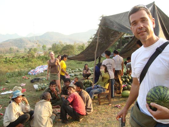So eine Wassermelone für gerade mal 30€ Cent, das sind ca. 3'000 kip, ja ihr seht, wenn hier jemand nicht mit Nullen umgehen kann, dann ist er in Lao am falschen Ort und ist schnell um sein Geld betrogen. Mit den beiden Ungarn hier war das lecker süsse Obst schnell verschlungen.