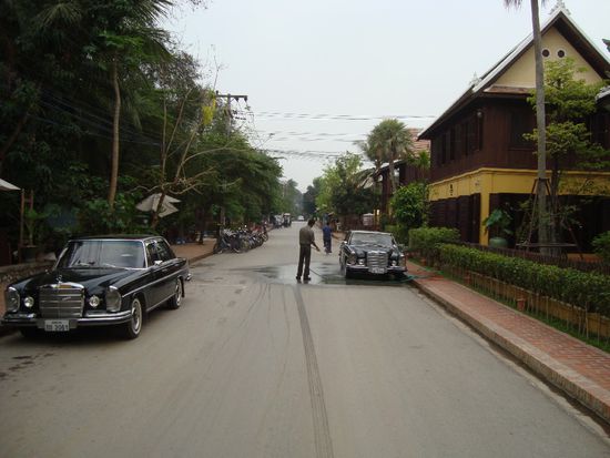 Auch so manches deutsches Prachtexemplar auf 4 Rädern findet sich in Luang Prarang. Daß diese beiden gut gepflegten Lieblingskinder von Oldtimerfreunden ihren Weg in den Mekong gefunden haben, ist vermutlich den Franzosen anzuhaften.