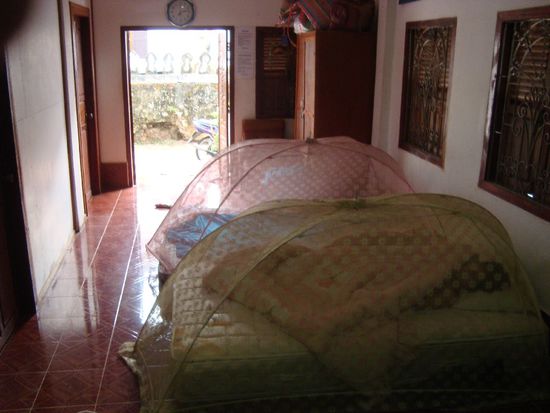 Anscheinend ein laotischer Brauch, daß das Wachpersonal unter Moskitonetz im Gasthauseingang die Nacht verbring.
