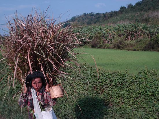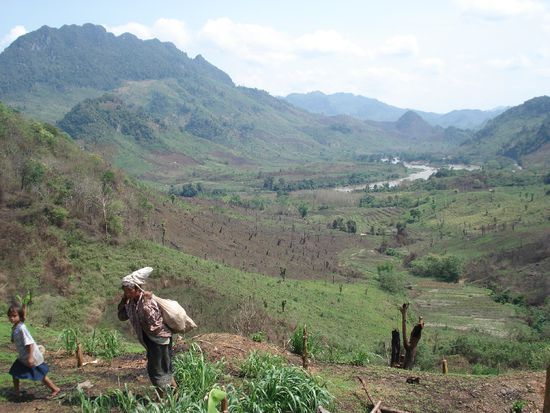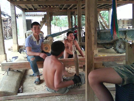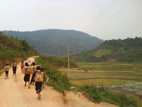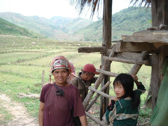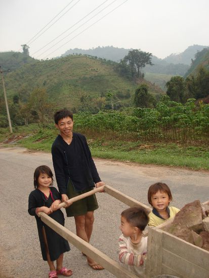 Von Luang Nam Tha gab ich Blacky am Folgetag die Sporen die 60 km hinauf nach Muang Sing, ideales Bergzeitfahren. Hatte nur meinen mehr und mehr um unwichtigen Balast erleichterten Hinkelstein- Rucksack zu tragen und keine Wagen mit Steinen zu schieben, wie dieser Arbeitstrupp hier.