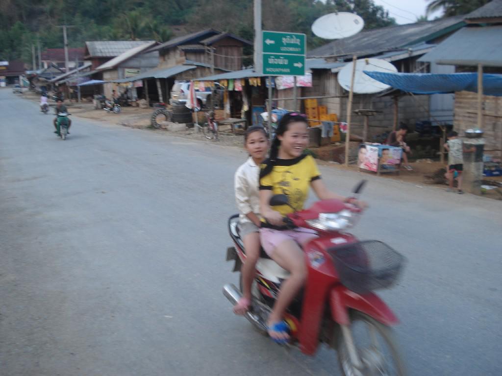 Seht, in Deutschland ist oft ein Fahrrad nicht genug für ein verwöhntes Kind wie mich, in Laos müssen drei Dreikäsehochs auf einem (gilt übrigens auch für Mopeds) Vorlieb nehmen. Aber dafür hat der Gruß auch dreifaches Gewicht.