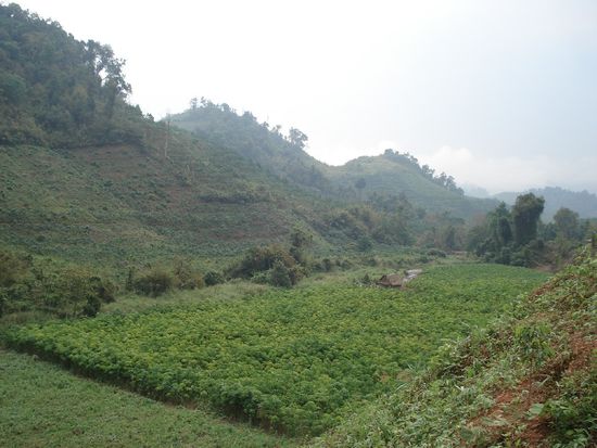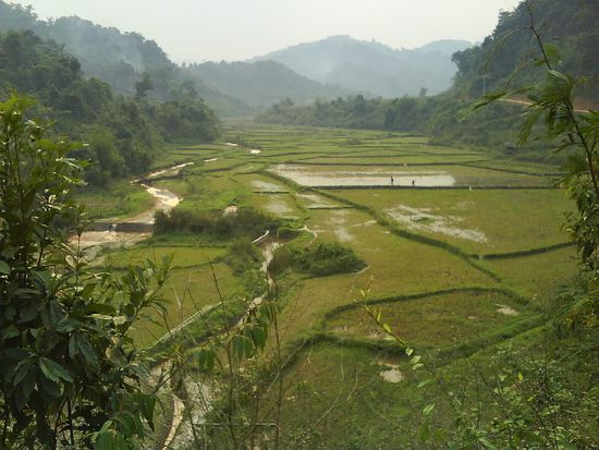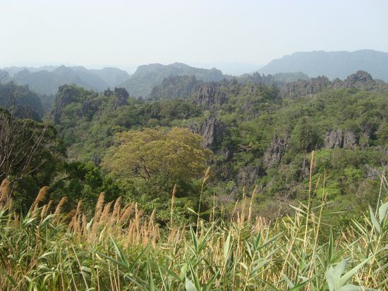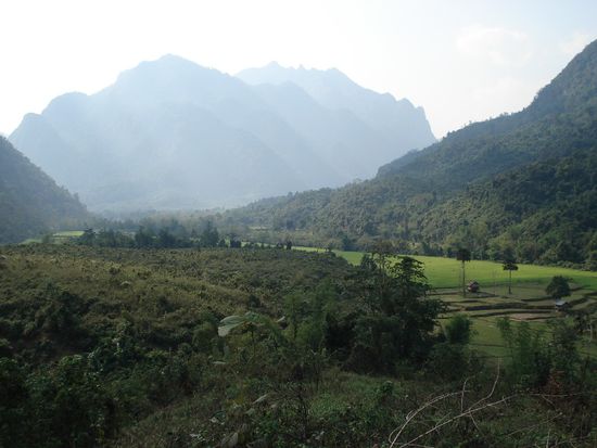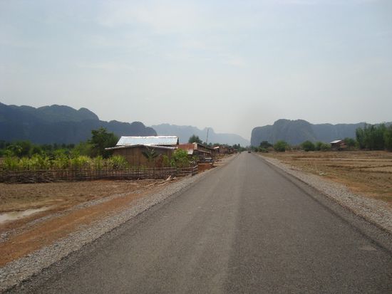 Der nächste Bus führte weiter südöstlich nach Vieng Kham. Von dort ging es mit dem Rad 80 km über Khoun Kham entlang durch eine Naturlandschaft wie in einer Computerspiel-Rallyestrecke, die alle paar Minuten ihr phantstisches Lanschaftsbild ändert...