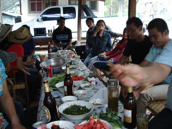 ..und so suchte ich nur nach einer geeigneten Party, um auch diesen Jahreswechsel gebührend zu feiern. Fündig wurde ich dann mehr oder weniger beim Landschaftauskundschaften, als ich plötzlich vor dem chinesischen Grenzübergang stand. Nun, dem Polizeitrupp war nicht zum Arbeiten und so nahmen sie mich in ihre Runde auf. Den Kasten "beer lao" gabs dann von meiner Seite als Gastgeschenk, dafür wurde ich ordentlich mit laotischer Kost verwöhnt.