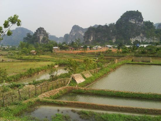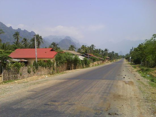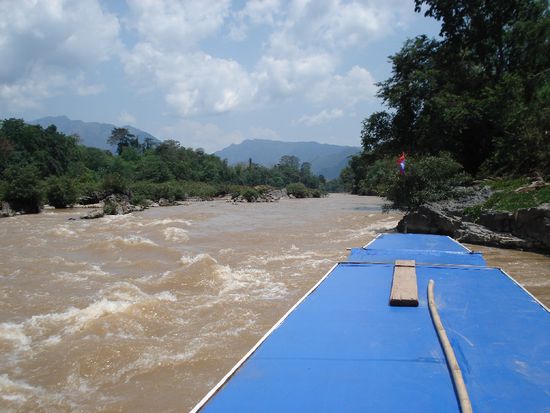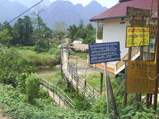 Vang Viengs Kalksteinlandschaft atemberaubend, es gibt Höhlen, die kilometerweit in den Berg hineinführen, die man nur auf einem LKW- Schlauch auf Wasserwegen erkunden kann udgl., einzig der Ort selbst hat sich zur Laos Partymeile herausgeputzt, in der eine Bar die andere schmückt und zumeist Engländer zu tief ins Glas schauen. Eine Nacht kann man hier schon mal alt werden.