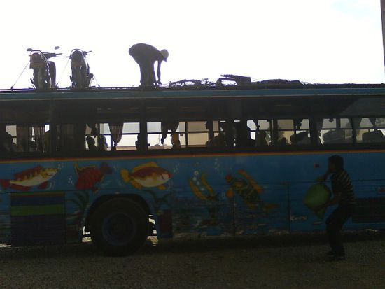 Das Boot charterte ich gemeinsam mit diesem Radelphanatiker aus Frankreich, der gut 35 kg Gepäck von Indien bis hierher verteilt in zwei Fronttachen, zwei Gepäckträgertaschen und einer fünften auf den hinteren beiden gestrampelt hat- und das mit Sandalen! Da blieb mir die Sprache weg. Dem Bike würde so mancher noch nicht einmal den Weg zum nächsten Bäcker zumuten, doch es hielt.