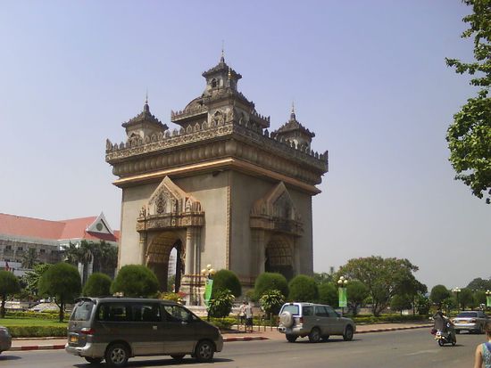 Das Patuxai, die Lao- Arc de Triumph- Kopie einst von den USA 1969 für einen Flughafenzugang gebaut,