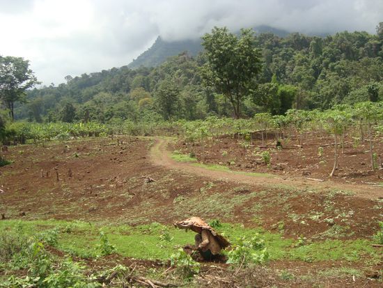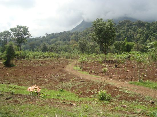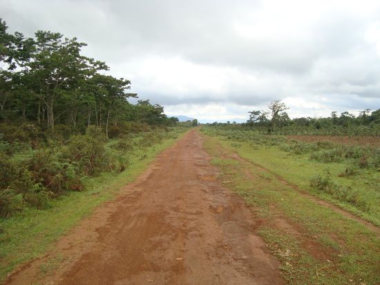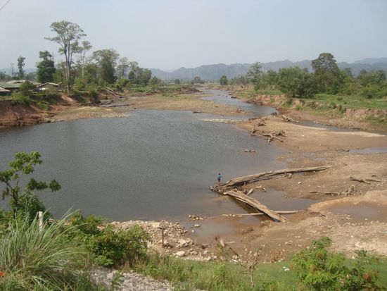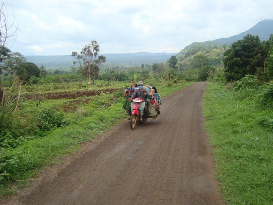 Daß der Streckenverlauf nicht so angenehm wie am Vortag sein sollte, das konnte ich aus meinem zum Radeln schlechthin miserablen Lao-Kambodia-Vietnam- Kartenmaterial ersehen , doch dass man aus mehreren hundert Kurven einfach nur einen Strich von A nach B zeichnet, an dem keine Höhenangaben zu finden sind, und z.B. eine 60 statt wirklicher 85 km daran zeichnet, das ist schlechthin Mord an Radfahrern. Erlaube es mir nicht, hier den Landkartenherausgeber zu nennen, doch empfehle ihm, sein Geld besser in der abstrakten Kunst zu verdienen.