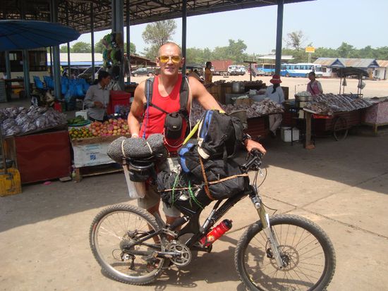 Am Folgetag in Savannakhet stieß ich denn auf diesen Briten, der sein Gepäck lieber über dem Rahmen befördert, da man sich da ja so bequem beim Radeln drauf legen kann, ..hätte da persönlich Angst einzuschlafen. Beachtlich auch hier, er schaffte das Nonstop von Bangkok hierher. Ihr seht also, es gibt noch eine Vielzahl anderer Radelwütiger Alleingänger, die alle ihre eigene Taktik fahren. Meist findet sich die ideale Abstimmung erst nach hunderten von Kilometern auf der Reise. Auch meine Ausrüstung sah zu Beginn noch ganz anders aus.