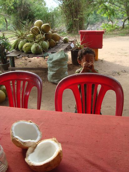 Statt Zuckerrohrsaft, Mango oder Melone gab es kurz vor Ausreise noch meine erste Lao- Kokosnuss und die Vitaminversorgung war gerettet. Übrigens auch eine Lao Spezialität sind gefüllte Mango mit Reis- köstlich