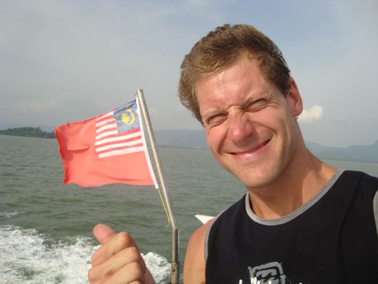 Ja, es viel mir schwer mich von Thailand zu trennen, wo es doch so viele Dinge aufzuzählen gibt, die ich in diesem Land so mochte. So versuchte ich mich auf der Schnellfähre ein wenig mit der malaysischen Flagge anzufreunden. Leute, das ist kein Bewerbungsfoto, bei der Windstärke bekam ichs aber einfach ned besser hin...schau aus wie in vielleicht 20 Jahren nach vielen nächtlichen Absackern.