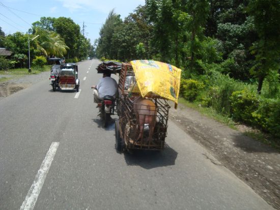 Die Strampelei ging weiter nördlich durch Botolan und Santa Cruz nach Dagupan. Nach 200 km war der Akku leergefegt, desweiteren begann die Regenwolke über mir , sich scheusslich zu entleeren- wohl Zeichen genug, aufzuhören. Blacky wurde kleingemacht und durfte die restliche Strecke busfahren.
