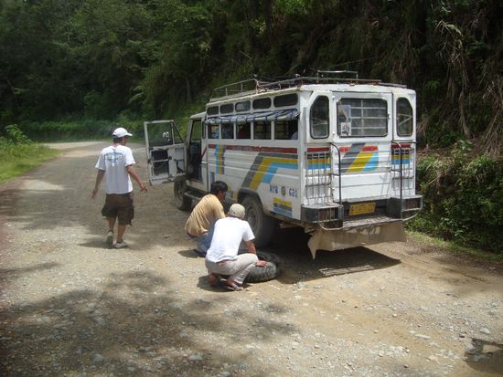 Mit Jeepney gings dann die Geröllpiste wieder hinunter ins Tal bis nach Bontoc. Der Plattfuß war reine routine. Es lagerten auf dem Dach neben Blacky noch zwei weitere Ersatzräder, die auf ihren Einsatz warteten.