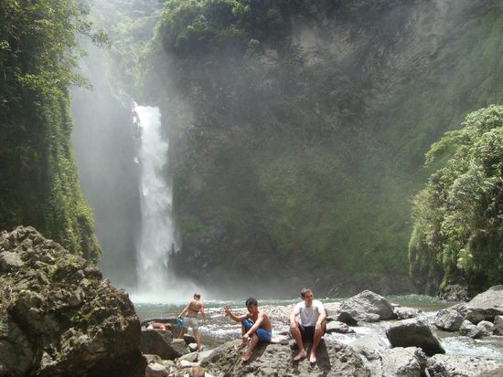 Die Reispaddies im Flusstal und auf Anhöhen eingebettet in den hoch hinauf ragenden Bergfelsen waren landschaftlich nur Zuckerli fürs Auge. Die steil mehrere hunderte Meter abfallende Böschung, die dem Weg seine Begrenzung vorgab, und auf dem sich der Busreifen nur zentimeter weit entfernt bewegte, weil die neuen betoniertten Strassenabschnitte zum Hang hin freigehalten werden mussten, verhieß bei dem einsetzenden Prasselregen, der denn den Weg noch in eine Modderpiste verwandelte, alles andere als ein gutes Gefühl. Vor Monaten soll dort schon einmal laut einem Niederländer ein Bus und ein Jeep sein Ende gefunden haben.