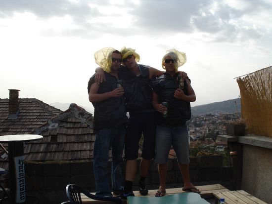 Man fühlte sich hier geborgen und Alkohol war leider die richtige Medizin, um sich wieder lockere Waden zu verschaffen. Gegen die starke Sonne halfen nur Müllsäcke.