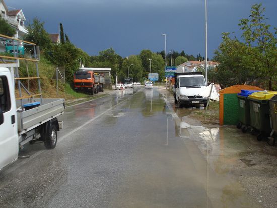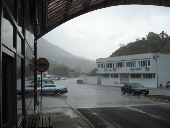 Am Grenzuebergang nach Montenegro hatte Petrus dann die Dusche voll aufgedreht. Ein Weiterfahren war für die nächsten 2 Stunden unmöglich. Durchnäßt und bei Wind war bibbern angsagt. Aber zum Glueck hatte ich ja meinen Schlafsack bei. So saß ich dann auf einem Stuhl in der Luma gleich nebst der montenegrischen Polizeiwache und las ein Buch bis der Spuk vorueber war, sicher ein lustiger Anblick.