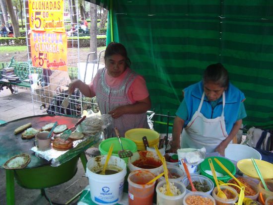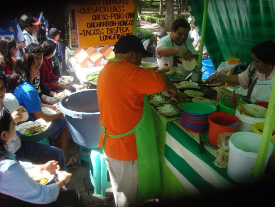 Geschmacklich herrscht große Vielfalt, bereits beim Nachbarstand schmeckt's wieder anders. Die Tacos selbst sind aus gelbem oder blauem Mais hergestellt, ebenso farbig sehen sie dann fertig aus. Die blauen Tacos fürs Auge gewöhnungsbedürftig, doch sie schmecken milder als die gelben.