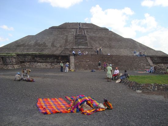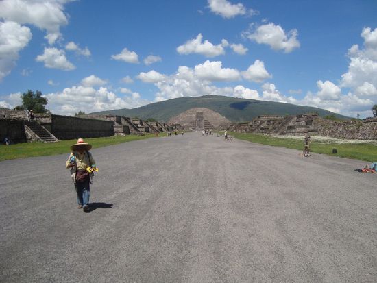 Die Straße der Toten oder "calzada de los muertos" führt zur Mondpyramide "piramide de la luna". Kein einfacher Weg vorbei an den Souvenirhändlern