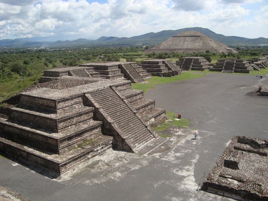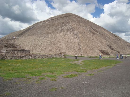 Die "piramide del sol" ist mit 70 Metern Höhe und 220 Metern Breite die größte auf dem amerikanischen Kontinent. Der Cheops in Aegypten mit 150 Metern kann sie da noch lange nicht das Wasser reichen, doch auch hier mußten viele Steine getragen werden..wahrscheinlich mehr Arbeit als mein Kampf auf der Straße das ganze Jahr über zusammen genommen Da zieh ich schon meinen Helm!