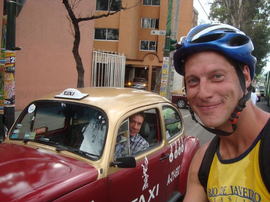 Einen Tag arbeiten mußte in Mexiko schon sein. Ein wenig ein Wagnis, wenn man diese Stadt mit Blacky verläßt und der gute Gaul den Weg nicht weiß. Die erste Aufgabe bestand darin, die Megastadt in die richtige Richtung zu verlassen und die zweite, abends wieder zum Ausgangspunkt zurückzufinden. Allein 30 km radelt man erst einmal, bis man sich nicht mehr städtisch glaubt. Den kleinen Auffahrunfall gleich zu Beginn ausgerechnet mit einem dieser süßen Käfertaxis verlief gerade nochmal glimpflich, denn der jobverfehlte Fahrer musste ausgerechnet auf der mittleren Spur eine Vollbremsung hinlegen, als er wohl einen potentiellen Passagier erblickte. Wie gut nur, daß die Käfer ein ideales Abrollheck besitzen-gute alte Technik, ich sags ja immer wieder. So'n oles Fließheck, und ich wär vielleicht wieder im mex. Krankenhaus aufgewacht .