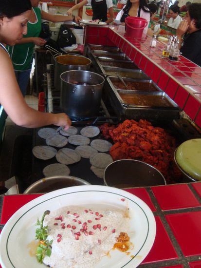 Das auf dem Teller ist die "Chiles en Nogada", eine mexikanische Spezialität, die 1861 für den Präsidenten Benito Juarez gezaubert wurde und besteht aus einer grünen mit Schweinehack und einem halben Dutzend Obst und Gewürze gefüllten Paprika, der "Chile" und wird überdeckt mit einer speziellen Sahne- Wallnußsoße, der "Nogada" , garniert mit Granatapfelkernen. Das Ergebnis sollte die Farbern der mexikanischen Flagge haben, wenn beim Kochen nichts schief ging. Schmeckt so gut wie sich's anhört.