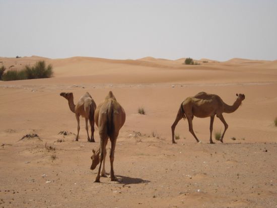 Nach Fahrt in die Wüste dann scheue Kamele..