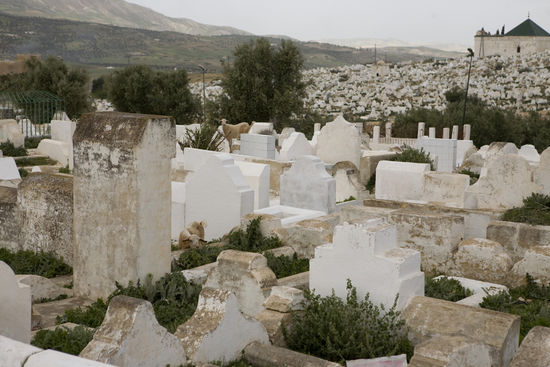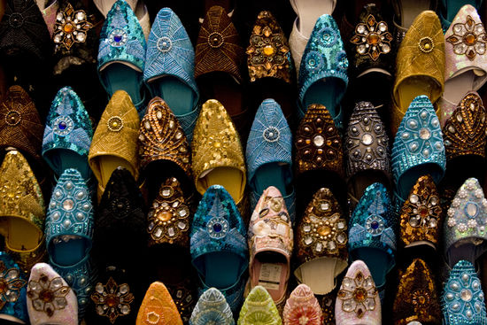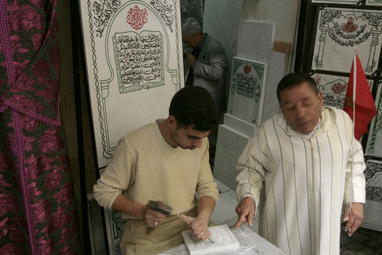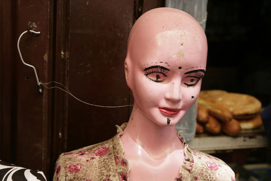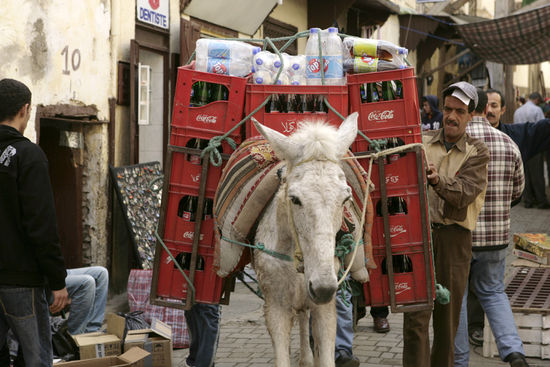 In einer seiner Erzählungen aus Marokko beschreibt Paul Bowles die Geschichte der schönen Malika. Sie ist blutjung, hat die Augen einer Gazelle und den Hals einer Lilie. Alle Männer drehen sich nach ihr um und sie weiß, dass sie schön ist. Es gibt in der Tat schöne Frauen in Marokko, oftmals ist ihre Schönheit aber mehr zu ahnen als zu sehen, versteckt unter Kopftüchern und kittelschürzenartigen Gewändern, oftmals schwarz, manchmal auch richtig bonbonfarben. Ältere Frauen tragen nicht selten einen Schleier vor dem Gesicht. Fotografieren lassen sich die wenigsten Frauen. Schon wenn sie eine Kamera von weitem sehen, drehen sie sich ab. Einige schöne Malikas im Suk von Fes ließen sich jedoch willig fotografieren, die Kleider- und Schaufensterpuppen, die so ganz anders aussehen, als ihre geleckten und gestylten Schwestern bei uns. Sie sind orientalischer, exotischer und rührend kitschig. In den engen, verwinkelten Gassen des Suk-Labyrinths bewegen sich nur Fußgänger, Lastenträger, Esel und Maultiere, deren Treiber mit dem Ruf "ballak" oder "attention" sich freie Bahn verschaffen. Die Gassen sind immer auf ein bestimmtes Handwerk oder Gewerbe ausgerichtet. Die Schmiede haben ihre Verschläge neben den Tuchhändlern, die Tischler neben den Lampenherstellern. Es gibt Schmuckgeschäfte, Schneider und Hersteller maßgeschneiderter Lederjacken. Das Leder wird im Suk gegerbt und gefärbt. Man sieht die Arbeiter von einer Terrasse aus, vor der Nase ein paar Pfefferminzblätter gegen den Gestank. Sie stehen bis zu den Knien in Bottichen mit farbiger, ätzender Brühe und kneten und walken das Leder. Dieser Beruf ist unendlich mühsam und gefährlich und es erfordert die Konstitution eines Kamels, um ihn ein paar Jahre ausüben zu können. Als Tourist wird man anschließend unweigerlich in die Schauräume zwangsgeführt und man kann sein Geschick im Handeln und Feilschen erproben, eine Kunst, die wir zum Glück in unserem Alltag nicht benötigen. Aber im Urlaub macht es Spaß, wenn am Ende beide zufrieden sind, der Sukkie, weil er mal wieder einem Touri viel zu viel abgeknüpft hat und der Touri, weil er den Sukkie durch hinhaltenden Widerstand an die Schmerzgrenze getrieben hat. In der Gruppe kann man aber dieses Erfolgserlebnis kaum erreichen. Man wird regelrecht durch die engen Gassen getrieben. Die Angst der Führer, jemanden zu verlieren ist augenscheinlich groß. Voran als Schäfer der kleine Mohammed, ein älterer Herr mit weißem Kapuzenmantel und roter Marokkofahne in der Hand. Er muss ein bekannter, verehrter Mann sein, weil ihm ab und zu von einem Bekannten die Stirn geküsst wird. Am Ende sein Hütehund, ein etwas vierschrötig aussehender Geselle, der die Herde antreibt, zusammen hält und verlorene Schafe zurückbringt. Im Hof der wunderschönen Medrese, der alten Koranschule, standen dann Herr und Helfer und hielten sich lange, lange und sehr innig die Hand. Anstelle des Mittagessens mit der Gruppe in einem romantischen Exklusivrestaurant zog ich es vor mit einem Taxi zum Friedhof zu fahren. Der Taxifahrer war unzufrieden, weil der Weg recht kurz war. Er wollte mich gleich wieder weg bringen und warnte mich eindringlich davor, allein an diesem einsamen Ort zu bleiben. Ich habe es dennoch gewagt und bin durch einen schönen Blick auf die Altstadt und den Anblick vieler Gräber entschädigt worden. Statt eines Räubers kam ein Friedhofarbeiter auf mich zu und küsste mir, ehe ich mich versah, die Hand. Die Gruppe fand ich wieder auf den Champs Elysées von Fes, der Prachtstrasse die entweder Boulevard Hassan II oder Mohammed V heißt, wie alle Prachtstraßen in Marokko. Die Palmen sind schön und der Springbrunnen ist schön, aber die elyseischen Felder sind mir schon deshalb lieber, weil man dort problemlos ein überteuertes Bier trinken kann, anstelle des preiswerten süßen Pfefferminztees.