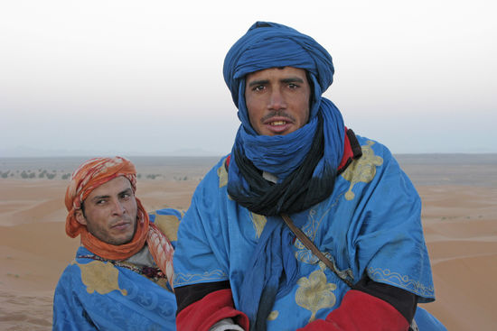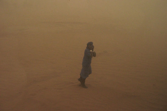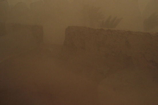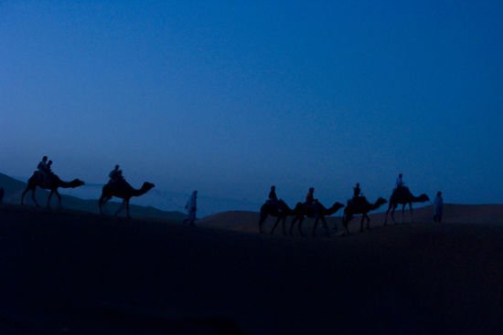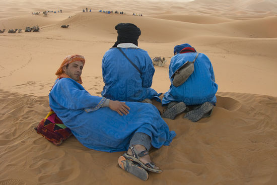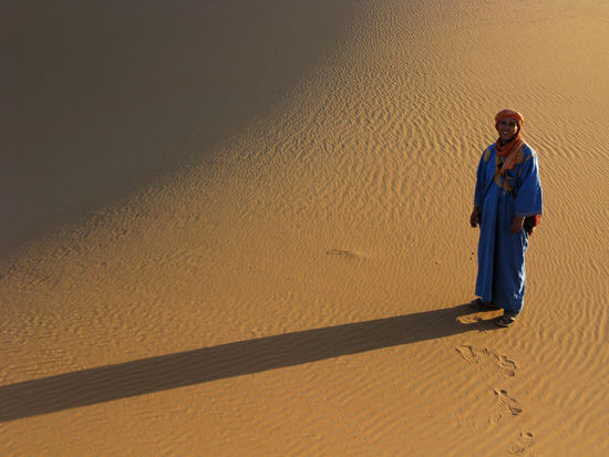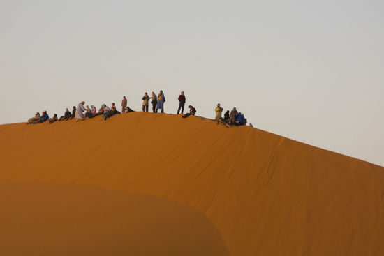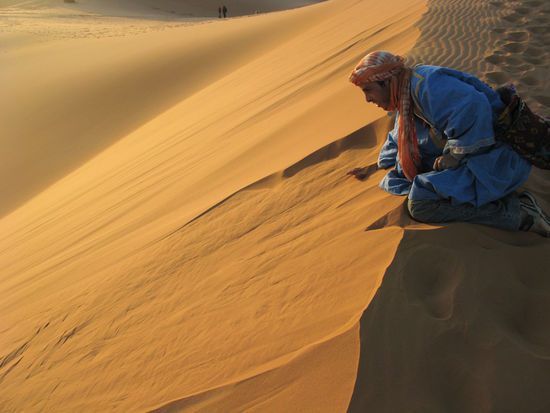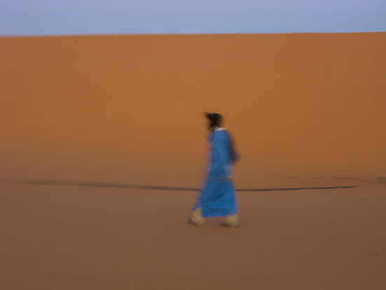 Beim Abstieg vom Hohen Atlas in die Oase Erfoud, wurde das Licht zusehends fahler und der Himmel trübte sich auf eine Weise ein, die für uns recht eigenartig war. Die Sonne schien wie durch Wolken, aber es waren gar keine Wolken da. Im Laufe des Nachmittags wurde das Licht immer trüber und es lag zunehmend Staub und Sand in der Luft. Als wir in Erfoud ankamen, tobte ein heftiger Sandsturm, schon seit mehreren Tagen. Die Sicht war stark eingeschränkt, die Palmen bogen sich im Sturm und es war verwunderlich, dass die vielen roten Blüten der Büsche von diesem Reibeisen nicht alle geköpft wurden. Auf dem kurzen Weg vom Bus zum Hoteleingang waren wir voll mit Sand. Durch die Türritzen in den Zimmern der Bungalows wehte der Sand und wenn man die Dusche verließ, bekam man braune Füße und hinterließ herrliche Fußspuren auf den Fliesen. Die vorgesehene Fahrt zu den höchsten Sanddünen Marokkos, um dort den Sonnenuntergang zu erleben, fiel buchstäblich in den Sand. Selbst der Versuch mit dem Bus eine nah gelegene Fabrik zu erreichen, in der ziemlich kitschig wirkende Tischplatten und Waschbecken aus Steinen mit eingelegten Fossilien hergestellt werden, scheiterte daran, dass vor dem Bus ein Auto im Sand stecken blieb und der Busfahrer daraufhin umdreht. Dieser Himmel über der Wüste war eine tobende, heulende, alles verschlingende, braune Masse. Daher konnten wir unser Glück kaum fassen, als sich in der Nacht der Sturm legte und wir um vier Uhr früh mit den Jeeps dem Sonnenaufgang entgegen fuhren. Kein Toben und Brausen in der Luft, nur friedliche Stille. Aus dem tiefen Schwarz der Nacht entstand langsam ein samtenes Blau. Die Umrisse der Dünen, die anfangs mehr zu ahnen als zu sehen waren, traten deutlicher hervor. Einige aus der Gruppe ritten auf Kamelen zu den Dünen, andere gingen zu Fuß, begleitet von blaugewandeten Tuaregs, die natürlich keine waren, sondern Berber aus einer nahegelegenen Ortschaft. Als sich die Sonne weiter dem Horizont näherte, wurden nicht nur die Kämme der Dünen und die Silhouetten der Kamele immer deutlicher, im goldenen Licht des frühen Morgens, sah man in dem von dem langen Sturm glatt gefegten Sand die Spuren von Wüstenmäusen und Scarabäuskäfern. Und wenn man seinen Blick gen Himmel hob, sah man auch die zahlreichen Touristen, die auf allen umliegenden Dünen saßen oder standen und die aufgehende Sonne fotografierten. Aber auch sie konnten das Erlebnis dieses Himmels über der Wüste, diesen kurzen Moment zwischen tiefer, dunkler Nacht und heißem, gleißenden Tag nicht beeinträchtigen. Ebenso wenig, wie die selbstlosen Tuaregführer, die sich so rührend um uns gekümmert hatten und deren Hand wir manchmal gern am steilen Dünenkamm ergriffen hatten. Sie wollten uns am Ende der Führung unbedingt ihre Fossilien verkaufen und wurden äußerst ungehalten, als die meisten aus der Gruppe ihnen klarmachen mussten, dass sie ihr Geld im Hotel gelassen hatten.