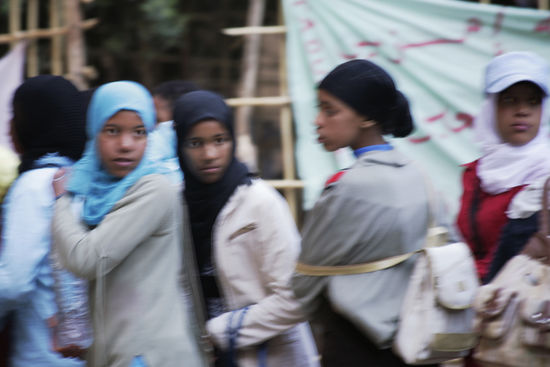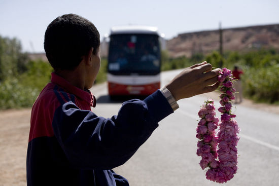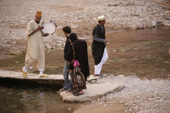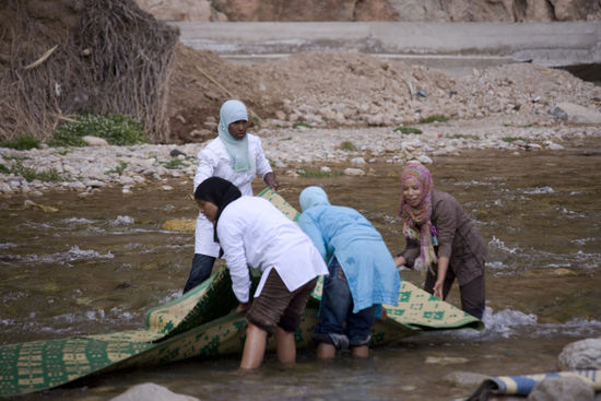 Der Bus bringt uns zur Todraschlucht. Hohe Berge links und rechts, in der Mitte der Fluss, der das ganze Jahr über Wasser aus dem Atlasgebirge in die Wüste bringt. Es ist Sonntag und viele Einheimische vergnügen und entspannen sich im angenehmen Dauerschatten der Schlucht. Eine Musikgruppe zieht durch das Tal, im Fluss werden Teppiche gewaschen und mindestens fünf Schulklassen haben sich in Reihe aufgestellt und warten auf den Abmarsch. Als ich ein Bild von dieser Szene mache, hebt ein Mädchen demonstrativ einen Stein auf, ohne ihn jedoch zu werfen. Das Fotografieren von Frauen ist eine Sache für sich, in diesem Land.