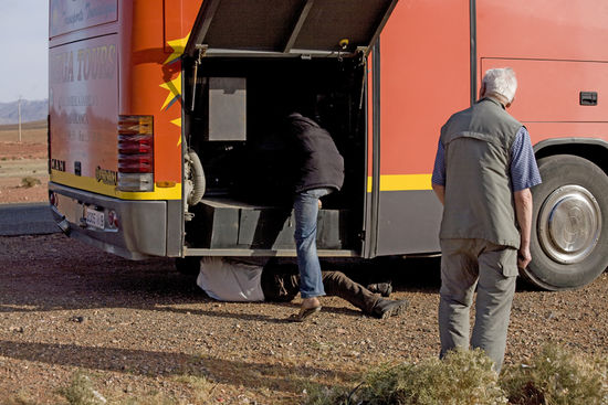 Als wir diese "Schlucht total" verlassen, verändert sich unsere Situation nach einigen Kilometern in "total schlecht", weil der Motor des Busses zu stottern anfängt und schlileßlich stehen bleibt. Alle Versuche des Fahrers ihn zur Weiterfahrt zu bewegen scheitern und auch der Mechaniker, der sehr rasch eintrifft, ist machtlos. Redouan hat per Handy Taxis geordert. Fünf alte Mercedes Diesel, die Standardtaxis für den mittelweiten Reiseverkehr in Marokko, bringen uns die restlichen 120 Kilometer nach Ouarzazate zurück. Eine schöne Fahrt in eine friedliche Abendstimmung, eine Wüstenlandschaft im warmen Licht, herrliche Wolken und der Beginn einer orientalischen Nacht. Es war schön und richtig, den Blick auf dieses Szenarium zu richten, weil der Blick zum Fahrer, einen grausen ließ. Einige waren total übermüdet und drohten einzuschlafen, der kleine Konvoi schlich am Ende der Reise nur noch lahm dahin, statt zügig zu fahren. Zum Glück kamen aber alle wohl behalten im Hotel an. Insofern hat der Ausflug zur Schlucht total dann doch nicht total schlecht geendet.