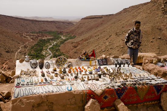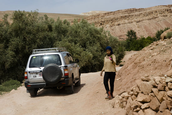 Telouet liegt hoch in den Bergen und der Weg dahin durch ein enges Tal war äußerst schön, mit farbigen steilen Felswänden und einem schmalen grünen Band in der Mitte. Die Straße war aber auch äußerst schlecht und eine Herausforderung für die Geländewagen. Als wir an einer besonders unübersichtlichen und schmalen Stelle auf Gegenverkehr stießen, ausnahmslos Toyotas mit Touristen, musste der Fahrer sein ganzes Können beweisen. Er ließ sich aber nicht aus der Ruhe bringen und schaffte es in wahrer Zentimeterarbeit, zwischen der steilen Felswand rechts und dem Abgrund von zwei- dreihundert Metern links, an dem anderen Wagen vorbeizukommen.