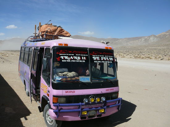 Dieses stellte sich jedoch als schwieriger dar, als gedacht. In Suedbolivien, insbesondere Sucre, sind die Fernstrassen blockiert. Also sind wir um fuenf Uhr mit einem Taxi vom Hotel in Richtung Potosi aufgebrochen. Dabei ging es im Dunklen ueber Feldwege. Da hiess es immer wieder aussteigen und schieben, Steine aus dem Weg rauemen, Steine in Schalgloecher fuellen. Nach 2 Stunden erreichten wir die normale Route und nach weitern 2 Stunden Potosi. Dort haben wir die letzte Strassensperre umfahren und einen Bus nach Uyuni erwischt. Die Fahrt ging durch eine Wild-Westlandschaft und dauerte 6 Stunden. Uyuni selbst ist trostlos und bitterkalt. Es gibt nur zeitweise Strom. Aber gelich gehts in den Salar. Die groesste Salzwueste der Welt.
