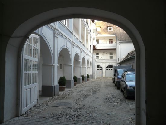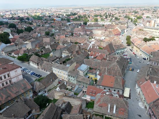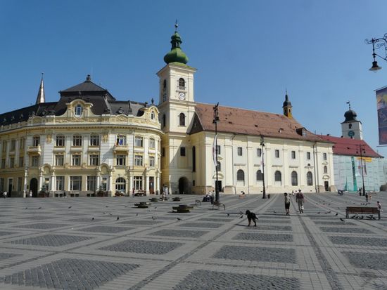 Am nächsten Morgen eile ich kurz vor acht schnell zum Auto, da man fürs Parken in der Innenstadt Parkscheine benötigt. Nur wo herkriegen? Ich frage auf der gegenüberliegenden Polizeiwachstube. Die nette Polizistin ist zwar liebenswürdig, kann auf Englisch aber nur grüßen. Sie ruft ihren Kollegen, einen gemütlichen, etwas in die Breite gegangenen Kumpeltypen, der mir mit drei Brocken Deutsch und zwanzig Brocken Englisch weiterhelfen kann und mich aufs Gemeindeamt an der Piata Mica schickt.