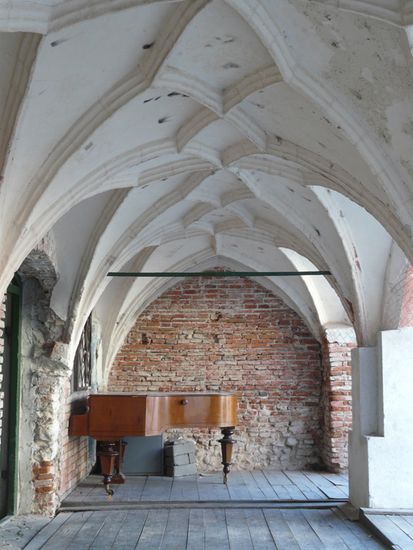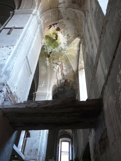 Bei einer verfallenen Klosterkirche ist das Vorhangschloss geöffnet. Ich kann nicht widerstehen und husche durch die angelehnte Tür ins Innere.