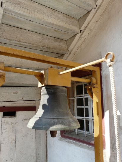 An der Altarwand macht sich eine ältere Frau zu schaffen, mehr betend und verneigend als putzend. Nach dem hundertsten Kreuzzeichen wendet sie sich mir zu. Sie spricht ein wenig deutsch und erklärt mir, dass die Kirche aus dem Jahr 1285 stammt und erst katholisch, dann protestantisch war, und jetzt orthodox. Als ich meine, ist egal, ist ja alles christlich, nickt sie mir lächelnd zu und führt mich durch die Kirche, zeigt mir mit geheimnisvollen Handbewegungen den Altarraum und führt mich dann in den Klosterhof hinaus, wo eine uralte Glocke hängt.