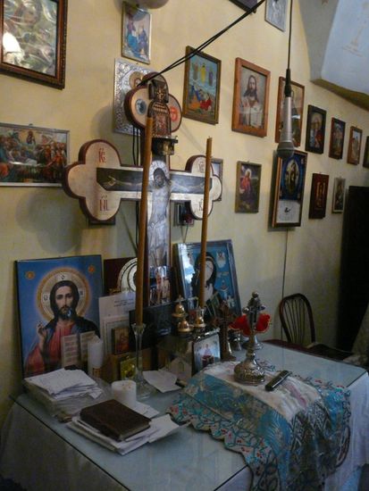 Er erzählt mir noch ein bisschen über die Kirche und die beiden alten Leute führen mich in die Apsis hinter der Kirche, wo sie einen kleinen familiären Altar eingerichtet haben.