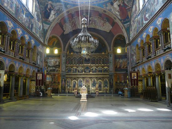 Da wir am Morgen keinen Gusto auf Pizza haben, müssen wir uns noch in der Bäckerei in der Strada N. Balcescu Schokocroissants kaufen, bevor wir die prächtig ausgestattete Metropolitankirche besichtigen.